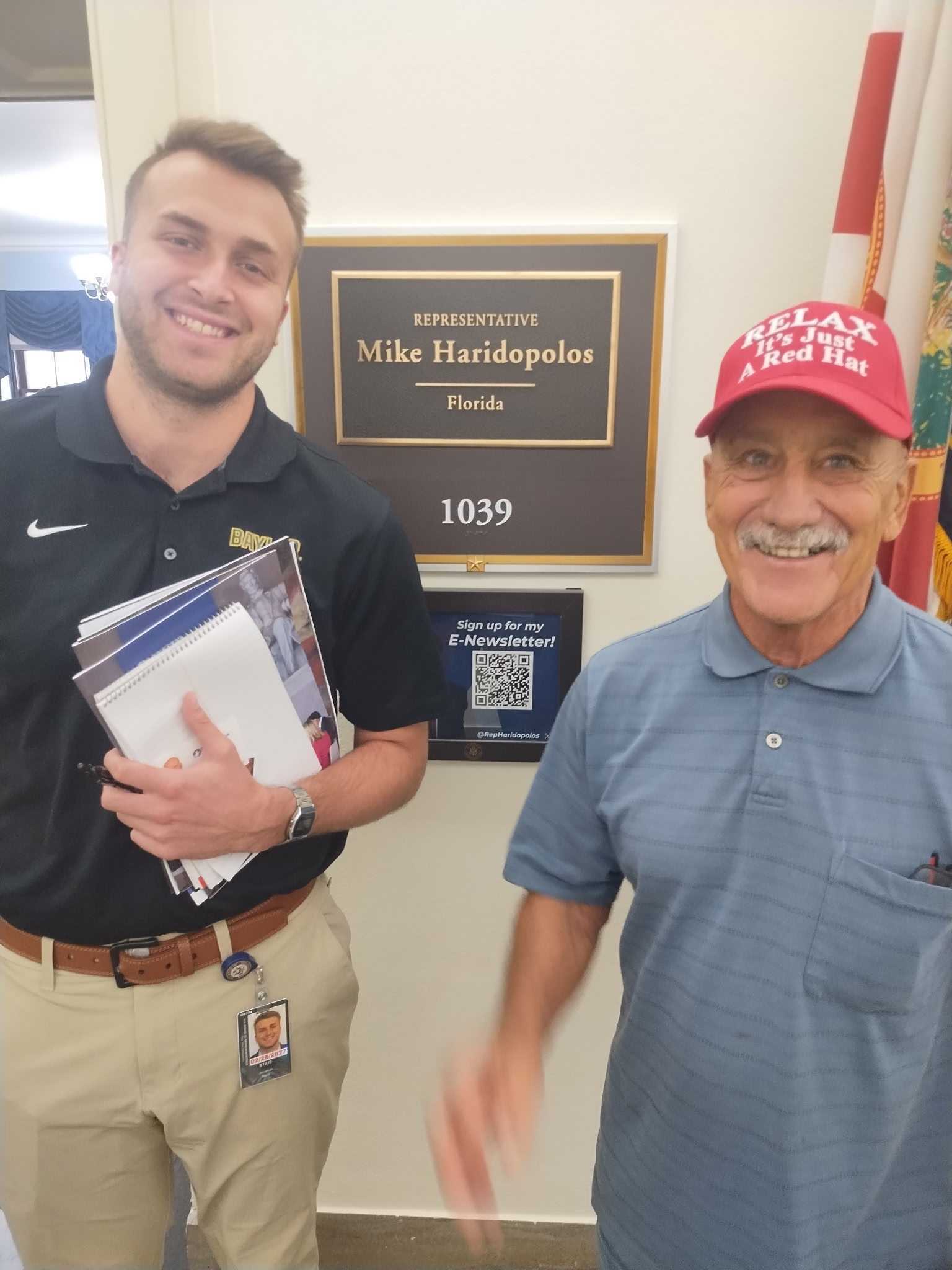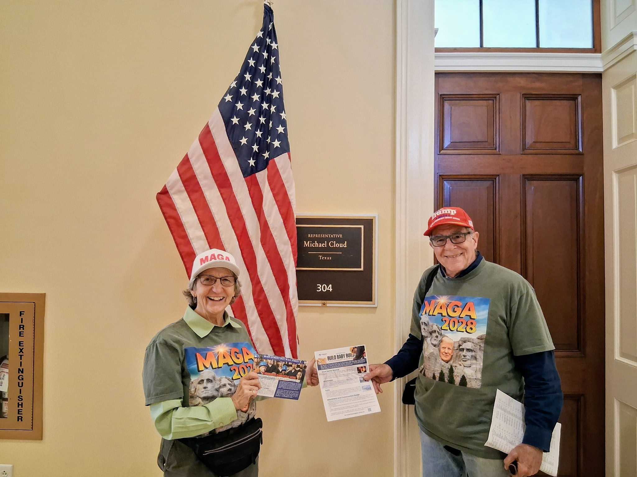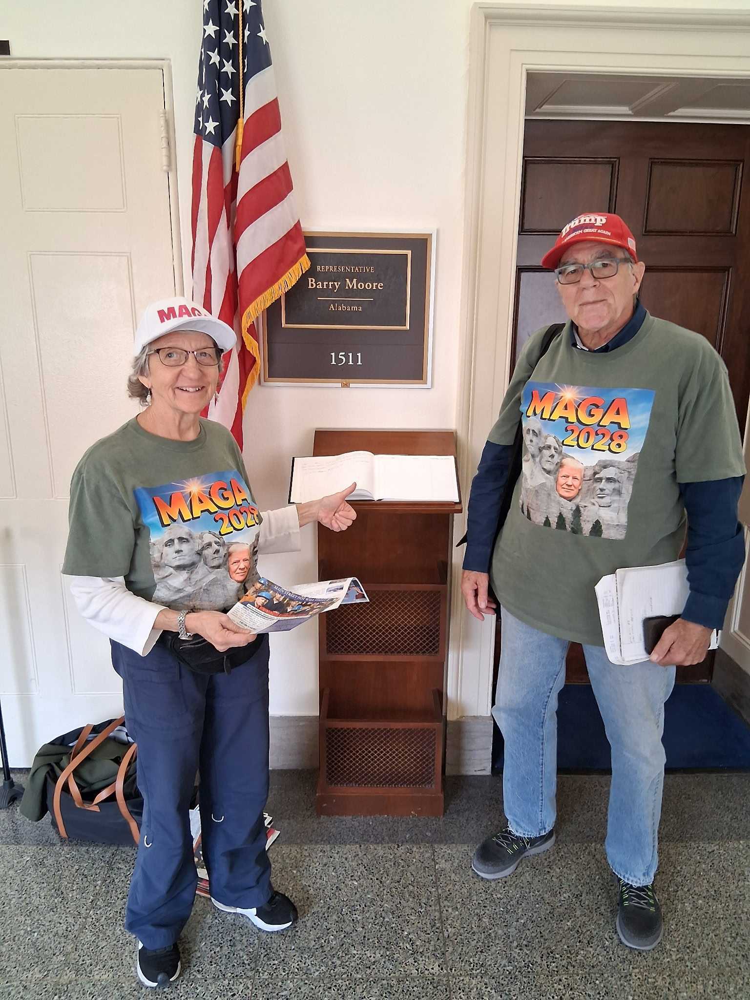 Peter and Marsha Bowen at Texas Congressman Michael Cloud's office, wearing our famous MAGA 2028 T-shirts with Trump on Mt. Rushmore -- a big hit!