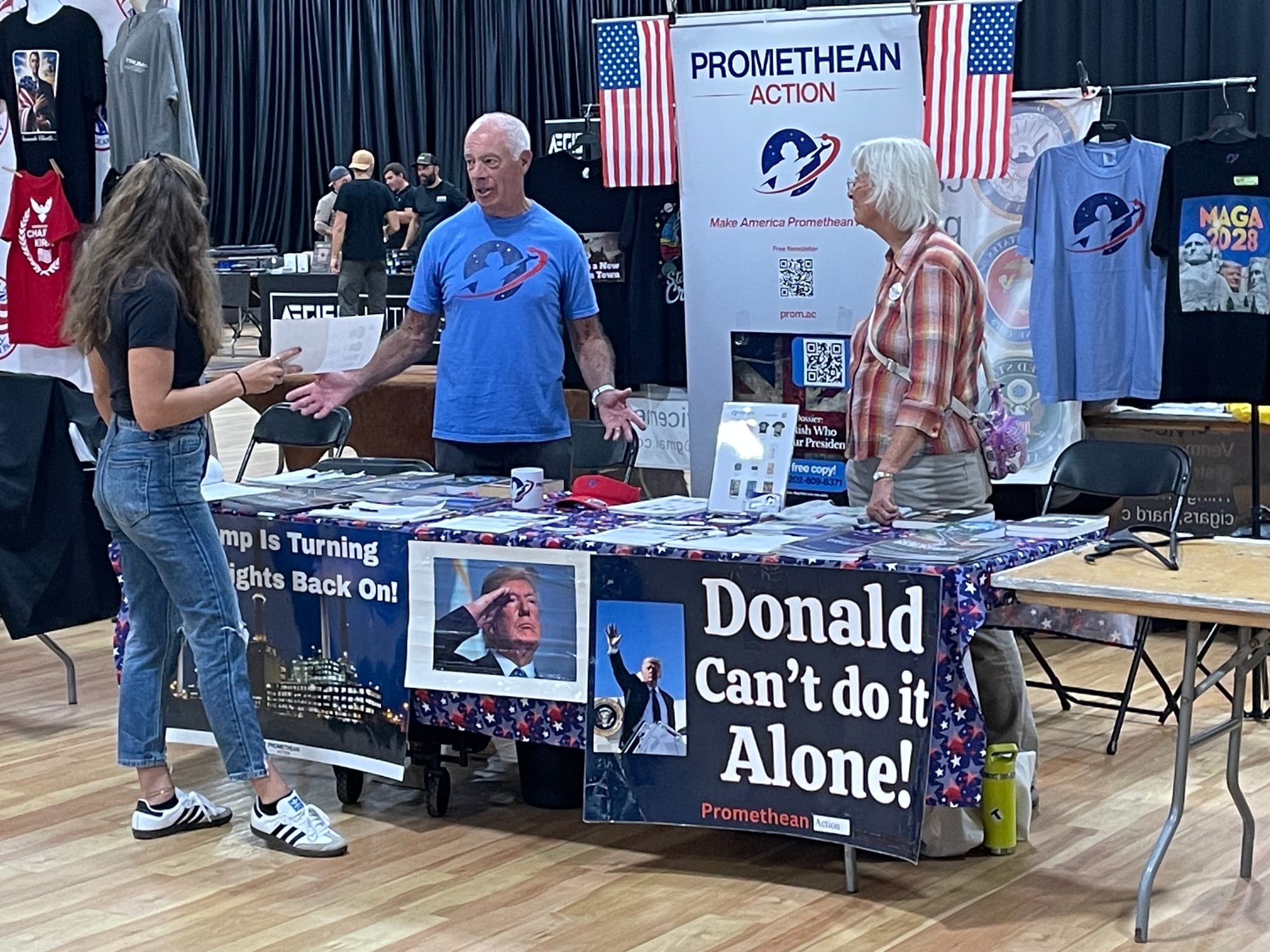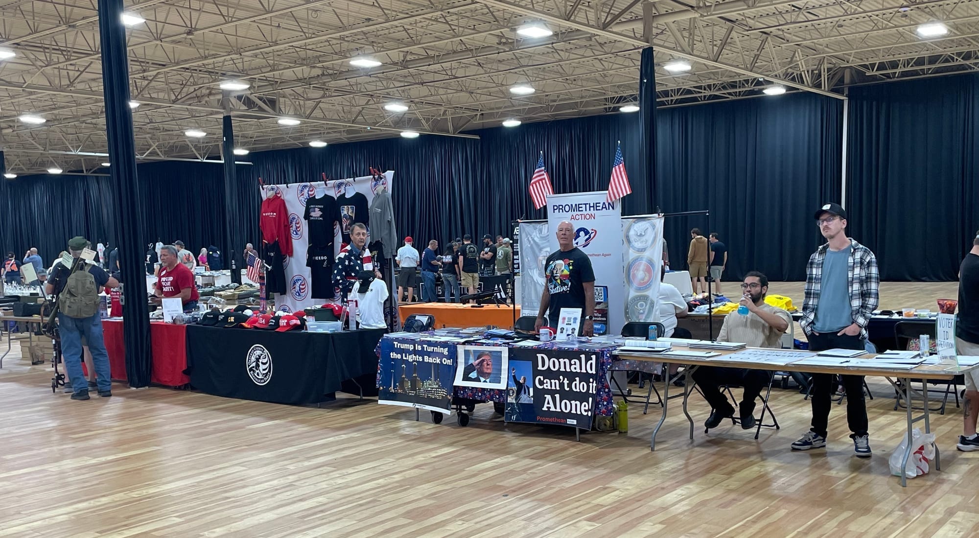 Detroit Gun Show attendees discussing President Trump and Promethean Action economics