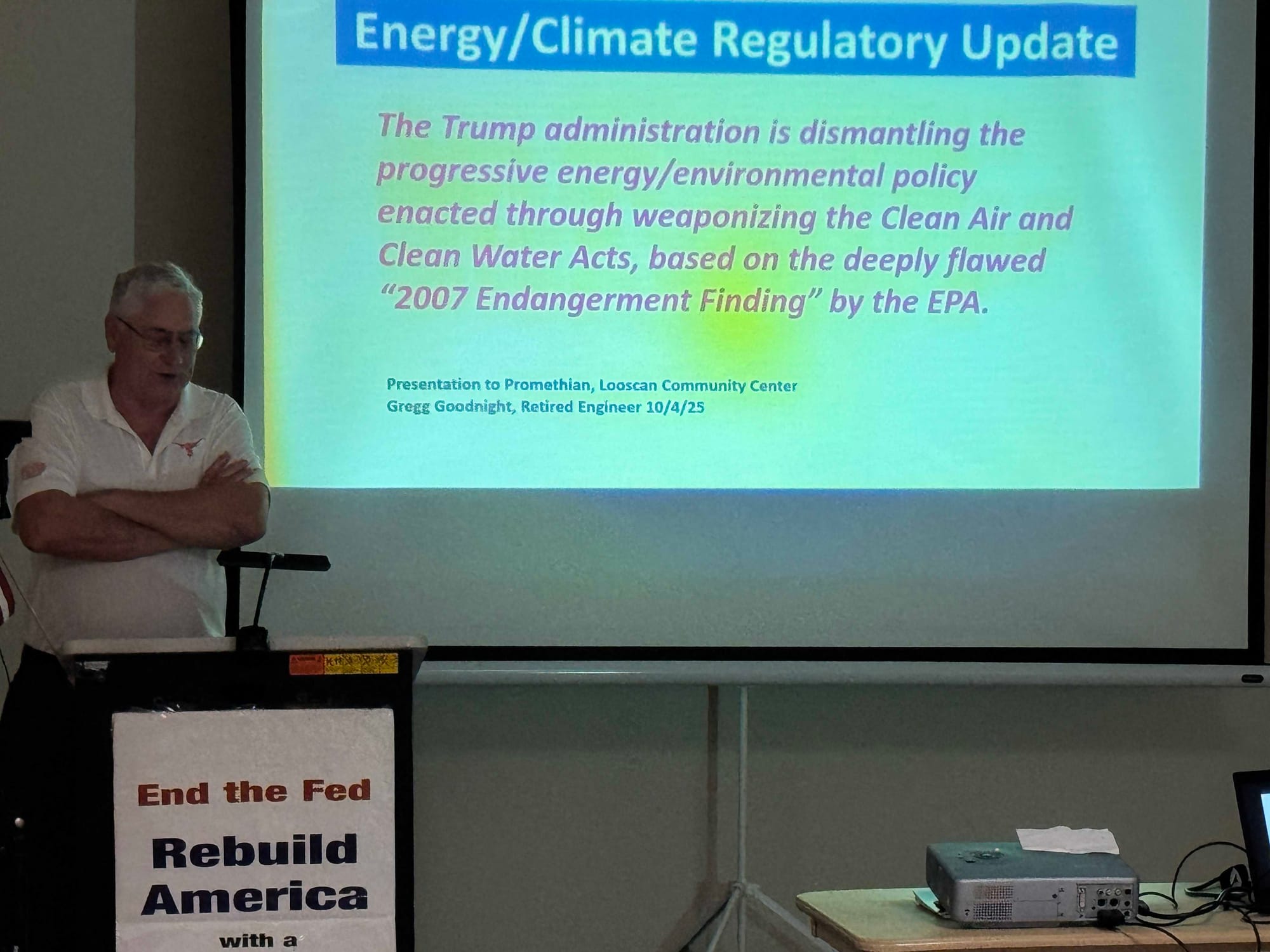 Gregg Goodnight, retired engineer and expert in real climate science, presented how the Green New Fraud is being rolled back and how we can build our energy grid, based on fossil fuels and nuclear, not wind and solar!