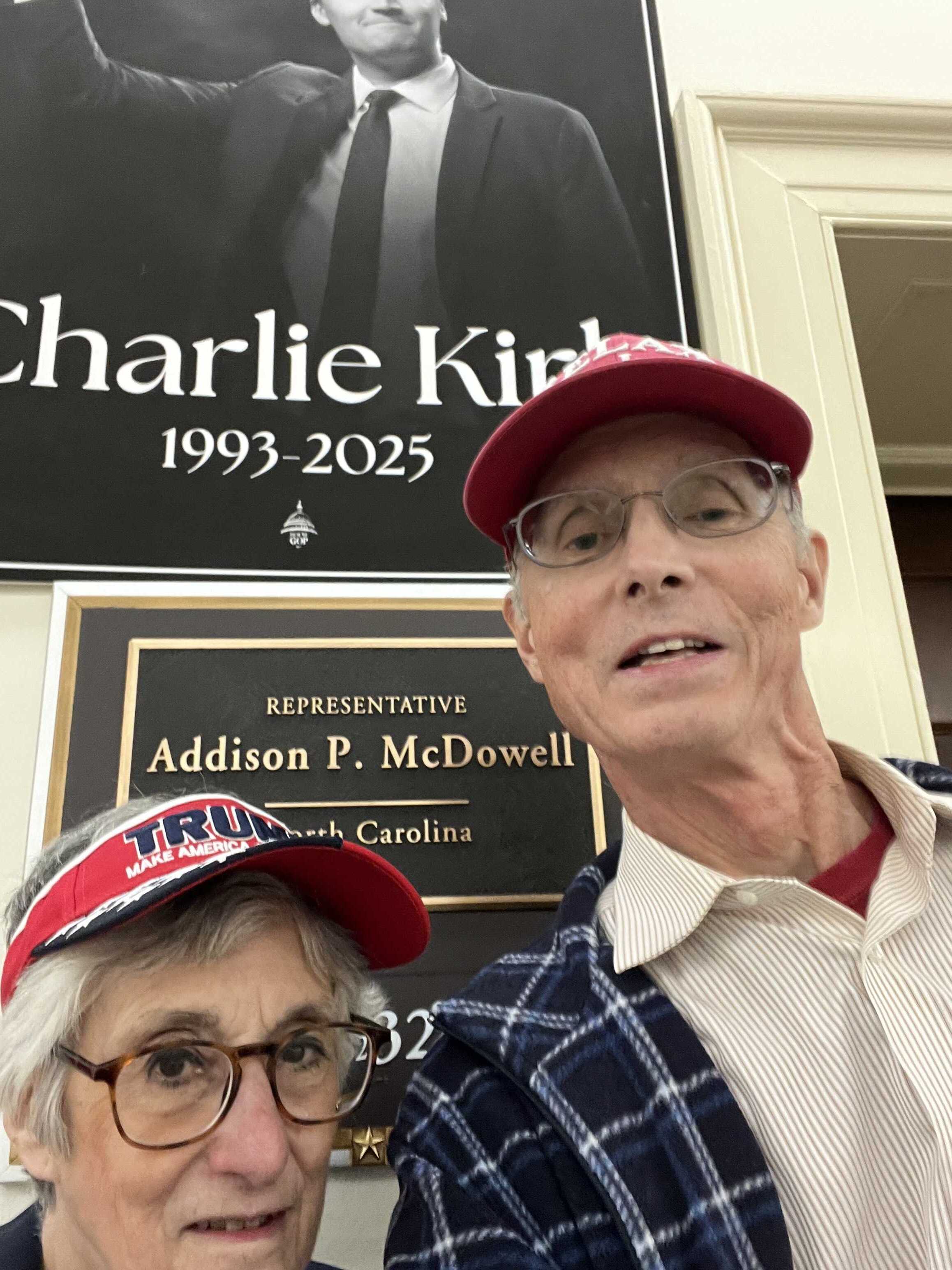 Mindy Pechenuk and Hunter Cobb outside an office displaying a Charlie Kirk poster. There were many of these all over Capitol Hill.