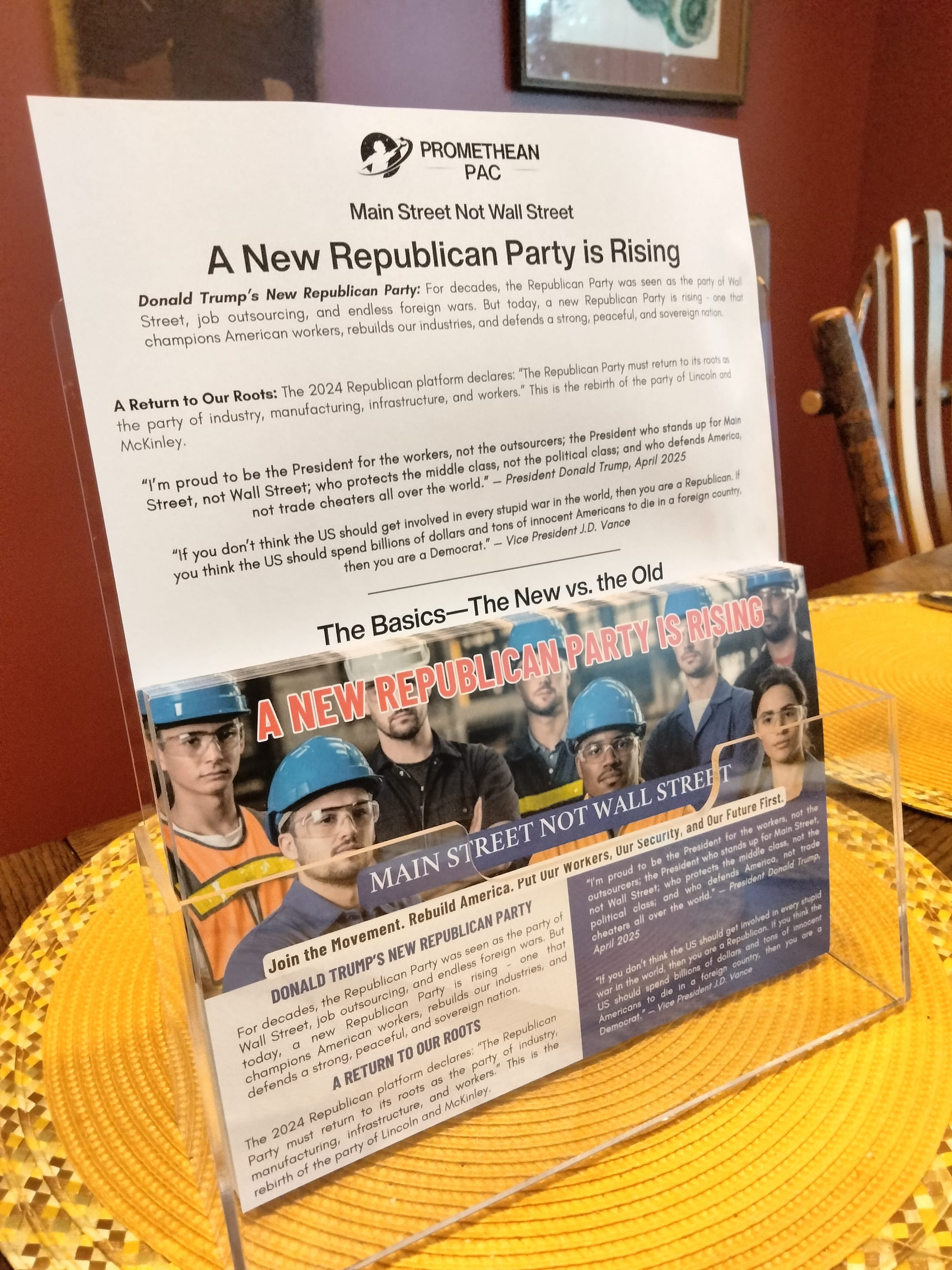 The political landscape in the country has changed since March. Promethean PAC has been circulating its new flyer, "Main Street Not Wall Street: A New Republican Party Is Rising." We will be talking to the Representatives about how they should get on board with the New Republican Party and support the economic policies of President Trump.