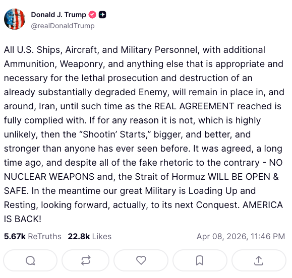 Well — at 7:42 PM Tuesday night, eighteen minutes before his own deadline, the President posted Iran's official ceasefire statement directly on Truth Social and let their own words speak for themselves.