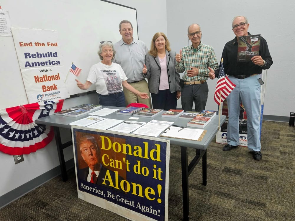 Every person who approaches our tables goes home with Promethean publications and printouts. The most popular? The Police Dossier on how the British kill American Presidents—because people are struggling to grasp who the real enemy is, who is out to get Trump and destroy the American system. And of course, how to defeat them.