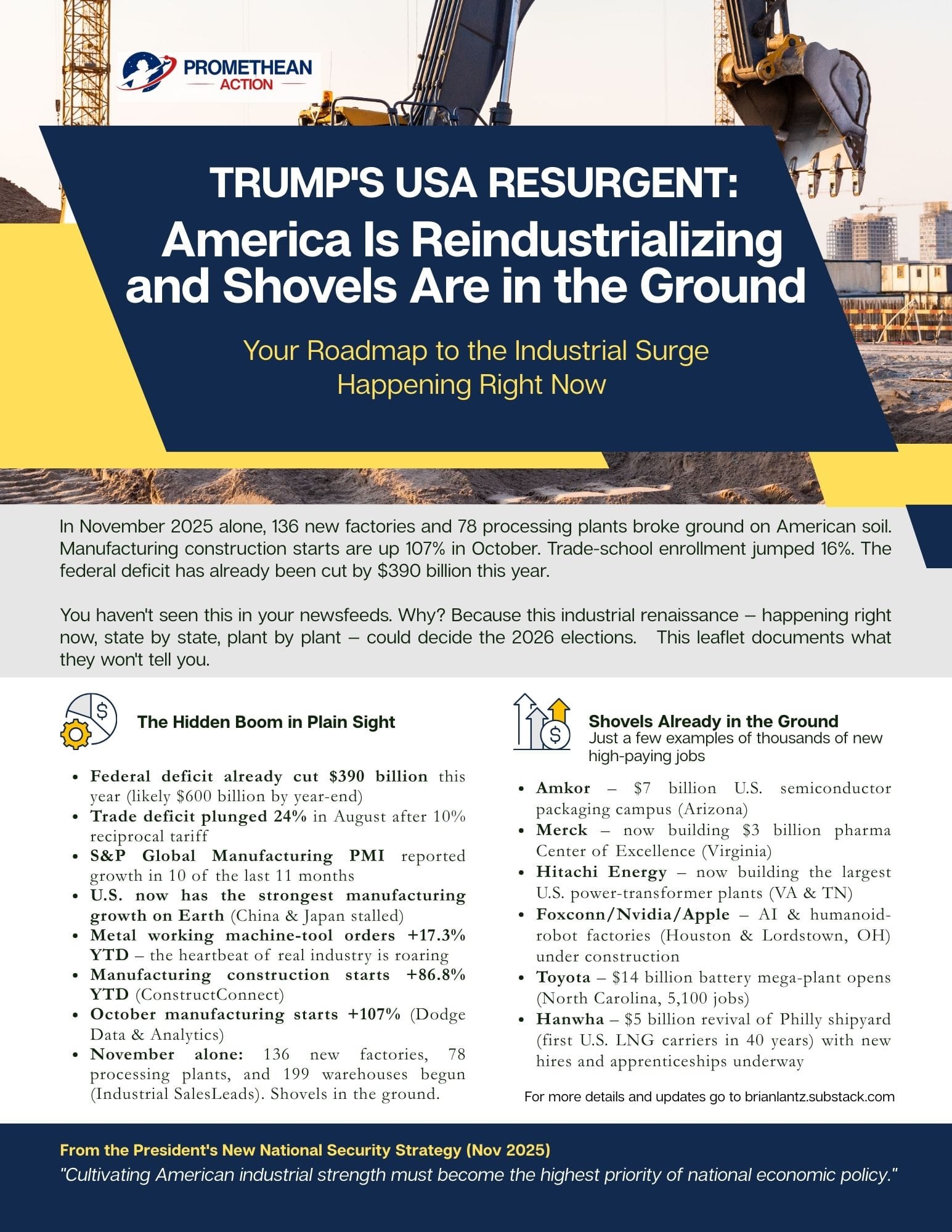 Leaflets: Professionally designed, fact-packed, and ready to print. We've distributed tens of thousands across the country. Our "Trump's USA Resurgent" leaflet documenting November 2025's 136 new factories, 78 processing plants, and 199 warehouses became a sensation—because nobody else was reporting it.