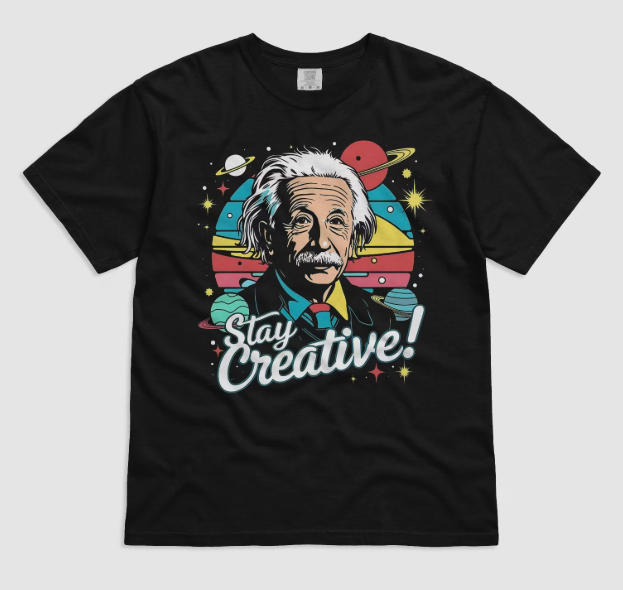 Featuring a colorful retro-style illustration of the legendary physicist surrounded by cosmic elements and an inspiring message "Stay Creative!", this tee celebrates the intersection of science and imagination.